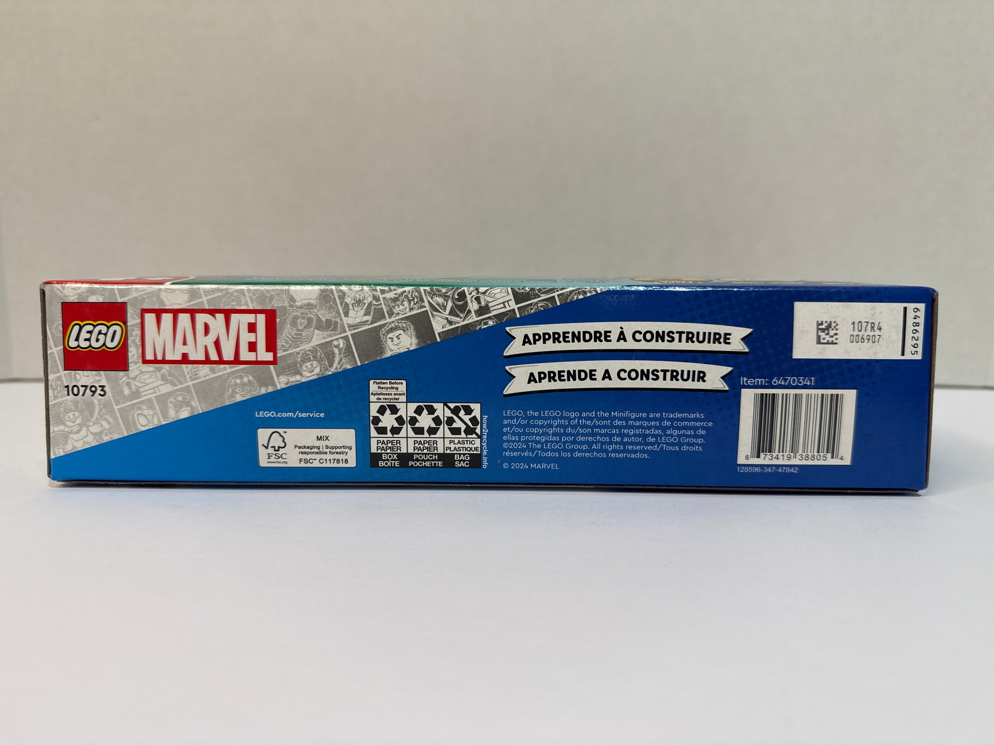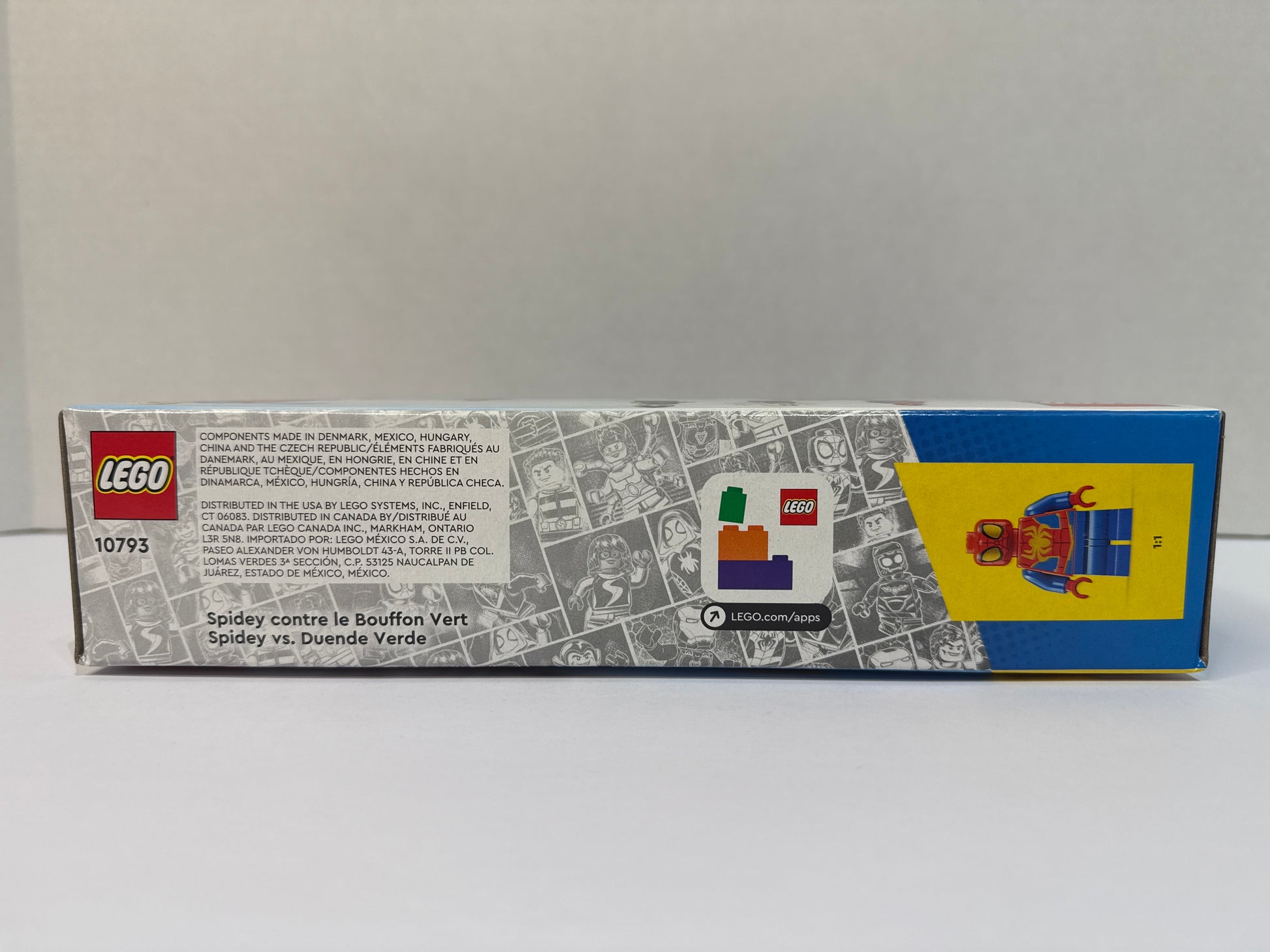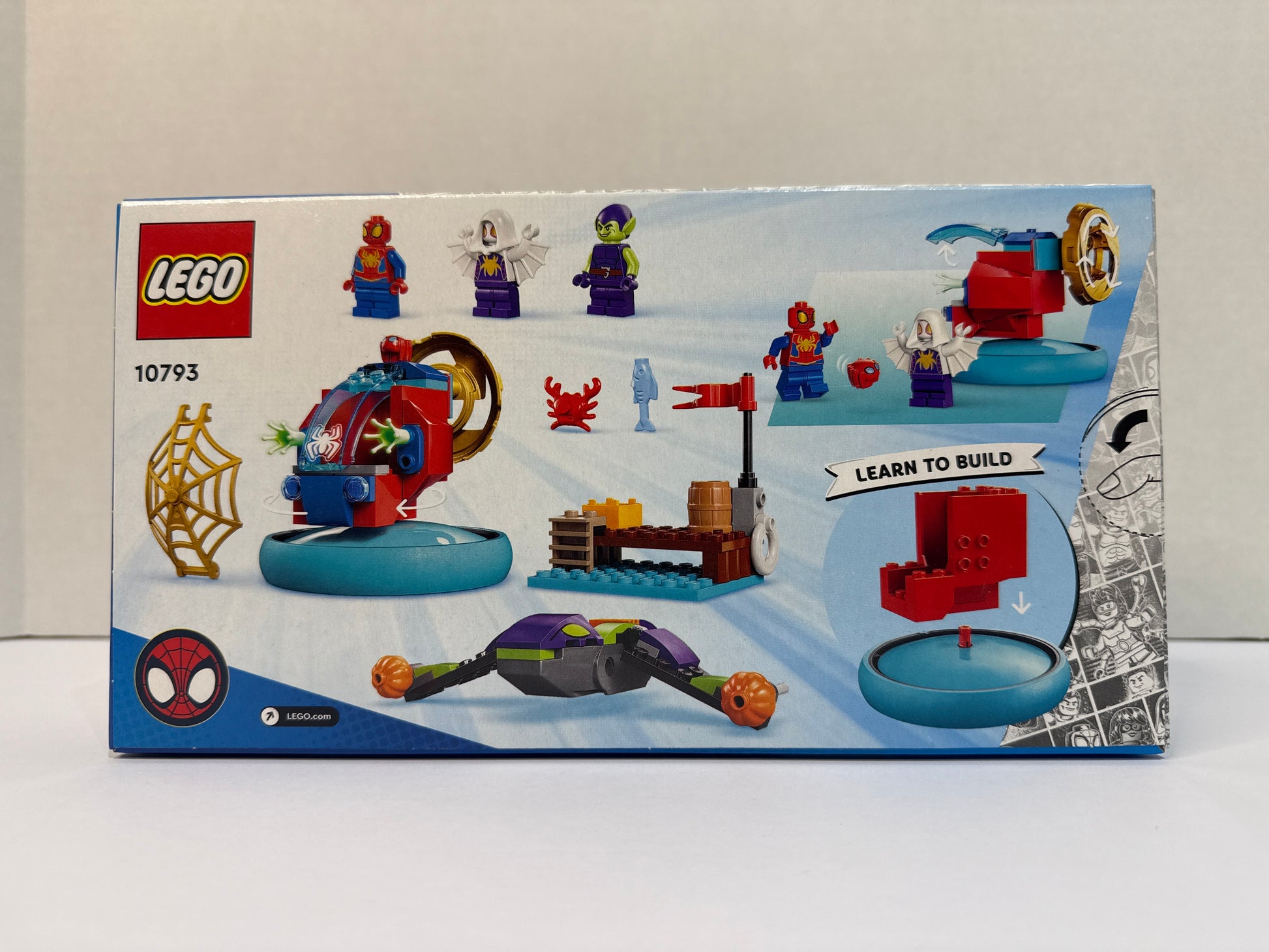 LEGO 10793 Spidey vs. Green Goblin was a 84 piece Marvel Super Heroes set with 3 minifigs released in 2024. It is a 4+ set and features a Spidey minifigure with a hover spinner, Green Goblin with a glider and pumpkin projectiles, Ghost-Spider with a golden web, Trace-E, sea accessories, and a crab. *Retired*